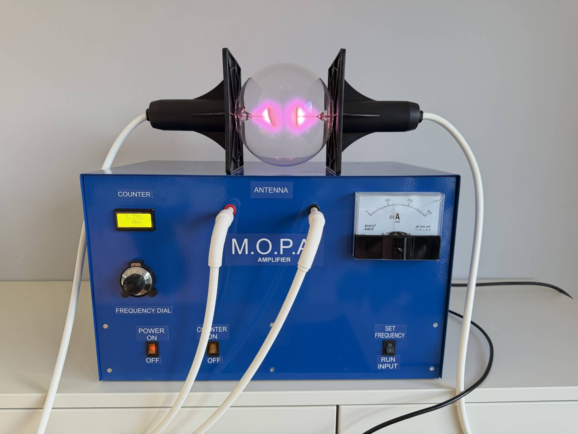 Dobrze, że to pytasz. Bo właśnie to pytanie oddziela świadomego profesjonalistę od kogoś, kto kupuje nazwę. M.O.P.A. to skrót od Master Oscillator Power Amplifier — i ta nazwa nie jest marketingiem. To dokładna replika architektury elektronicznej, którą Rife stosował w swoich oryginalnych urządzeniach z lat 30. Różnica między M.O.P.A. a większością urządzeń na rynku jest następująca: wiele współczesnych konstrukcji pracuje w zbyt niskim zakresie częstotliwości, nie posiada lampy plazmowej, nie generuje fali nośnej, nie wytwarza sygnałów w megahercach, nie dysponuje odpowiednią mocą i nie ma możliwości przemiatania częstotliwości. Rife M.O.P.A. spełnia wszystkie historyczne kryteria bez wyjątku: zakres pracy do 4 MHz, fala nośna 3,3 MHz z regulacją do 3,33 MHz, potężny wzmacniacz mocy, lampa plazmowa z helem z elektrodami pod kątem 45°, funkcja przemiatania częstotliwości i obsługa fal arbitralnych. Jest to autentyczna replika amplifikatora nadawczego Rife’a z lat 30. i 50. XX wieku — nie interpretacja, nie uproszczenie. To rekonstrukcja.