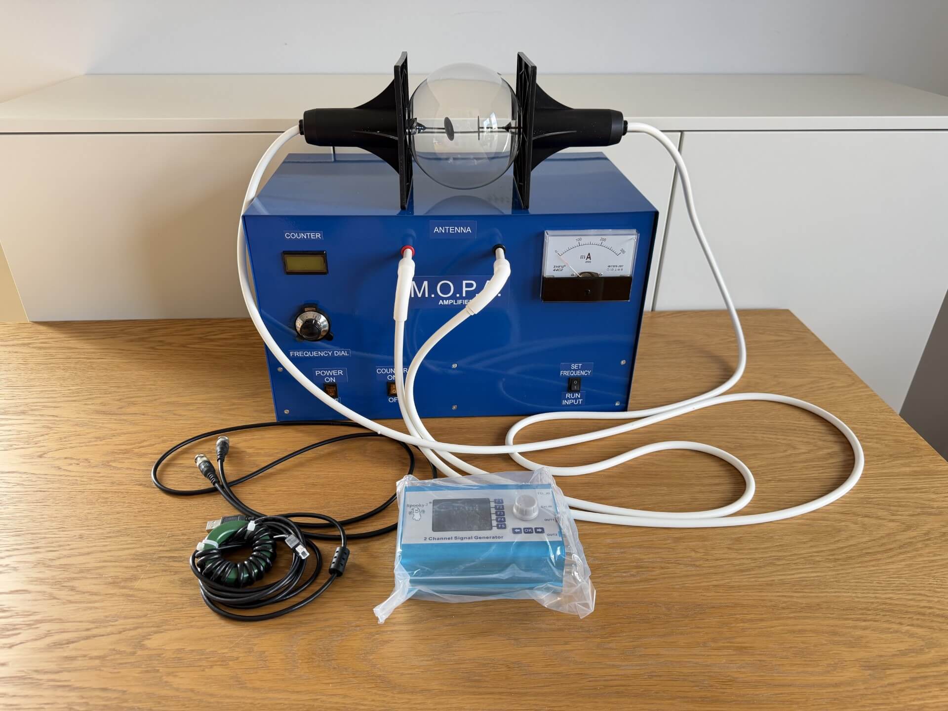 To argument, który pada często — i zasługuje na konkretną, techniczną odpowiedź, nie na ogólniki. Zwykły generator funkcyjny wytwarza sygnał. Ale sygnał to nie to samo co rezonans terapeutyczny. Problemem jest moc i sposób transmisji. Jakikolwiek generator funkcyjny może generować częstotliwości stosowane w oryginalnej maszynie Rife’a. Czego mu jednak brakuje, to mocy wyjściowej. Urządzenia klasy M.O.P.A. z lampą plazmową są wynikiem dziesiątek lat intensywnych badań i rozwoju — i posiadają zdolność emitowania wszystkich oryginalnych częstotliwości z odpowiednimi poziomami mocy. Drugi problem to brak fali nośnej: niska częstotliwość sama w sobie nie przenika tkanek. Ale kiedy zostanie nałożona na falę nośną w zakresie megaherców — dociera do wnętrza komórek. Bez fali nośnej nie można mówić o technologii Rife’a. Tani generator nie ma ani mocy, ani fali nośnej, ani lampy plazmowej. Można go porównać do posiadania fortepianu bez strun — instrument jest, dźwięk nie.