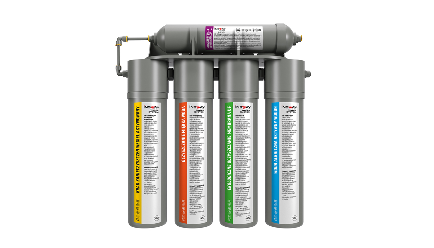 - Filtr INSWAY strukturyzujący i rewitalizacjący wodę. Celem rewitalizacji wody jest przywrócenie jej pierwotnej struktury. Wpływa to pozytywnie na właściwości mikrobiologiczne i fizyczne wody. Zastosowanie strukturyzującego wkładu zmienia fizyczne właściwości wody co ma decydujący wpływ na transport tlenu, substancji odżywczych i minerałów do komórek organizmu. Filtr liniowy zmniejsza napięcie powierzchniowe wody, powoduje niższą radioaktywność, dezaktywuje szkodliwe substancje (eliminuje toksyny), zwiększa zdolność do regeneracji.